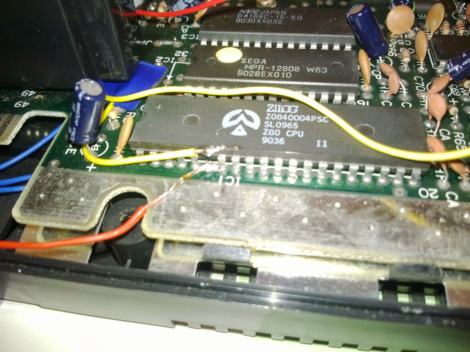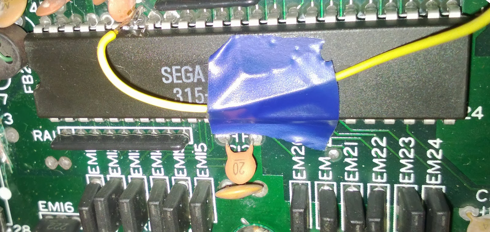 3 - Localizamos el chip "SEGA 315-5237" y SIN cortar nada en la patilla numero 42 le soldamos una cable.