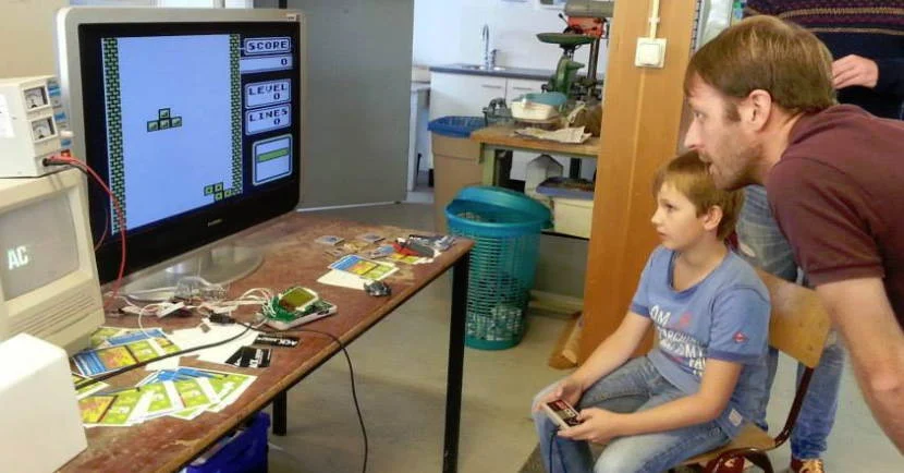Se trata ni más ni menos de una modificación para conectar la Game Boy clásica (la tocho, ladrillo) a una TV moderna por HDMI, y usar los mandos de la NES para jugar.