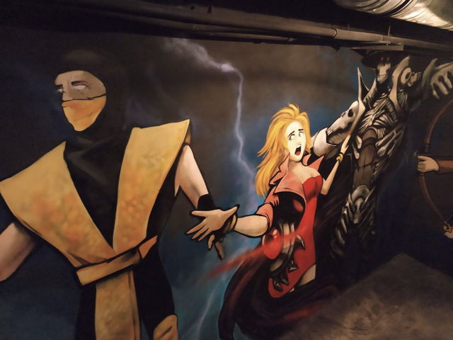 Está muy bien ambientado, con las paredes pintadas con dibujos de juegos retro, muy chulo. Es la antesala de lo que nos espera al bajar las escaleras...