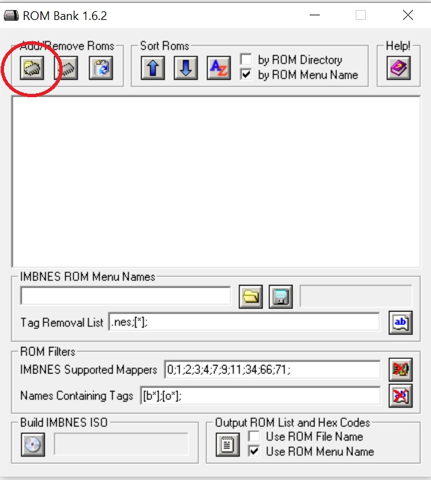 Carga las ROMS en formato .NES de la carpeta donde las tengas guardadas. Puedes cargar todo el directorio de golpe o de una en una. El icono de la izquierda es para cargar todas las ROMS del directorio de golpe, pero si queréis montar la imagen con ROMS que estén en varias carpetas o seleccionarlas de una en una, presionar el botón que hay a continuación.