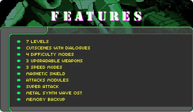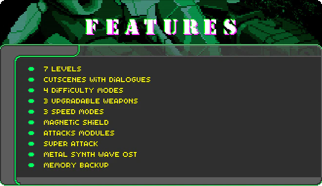 El juego nos ofrecerá 7 niveles, escenas con diálogos, varios modos de dificultad, 3 tipos de armas actualizables, varios modos de velocidad, batería para guardar partida, etc.