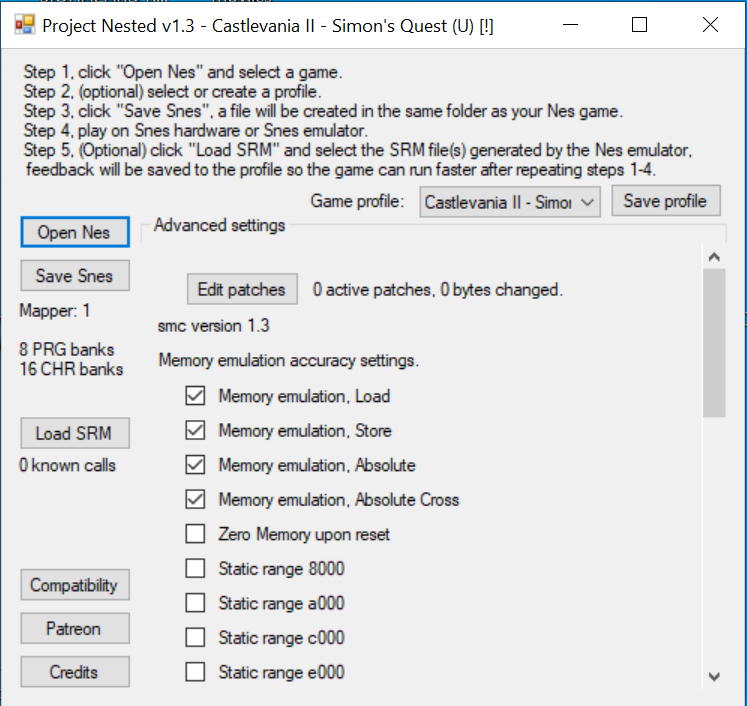 Como veis el emulador una vez abres la ROM de NES permite guardar perfiles del juego por si modificáis valores del emulador, pero esos valores hay que saber tocarlos y se ponen por defecto, entiendo que alguien que sepa de emulación pueda jugar con ciertos valores y mejorar la compatibilidad de algunos juegos pero recomiendo no toquetearlos. También podéis cargar archivos SRM (guardado de partida) de juegos con batería generados por un emulador de NES y cargarlo en vuestra nueva ROM generada de SNES. Os recomiendo que generéis las ROMS de juegos con compatibilidad en la lista oficial para evitar incompatibilidades.