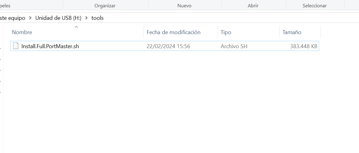 Por defecto ya viene el core PortMaster instalado en la tarjeta de memoria MicroSD donde se alojan las ROMS, pero por algún motivo no funciona, por lo que hay que borrar la carpeta donde se aloja la versión predeterminada e instalar la más reciente para que todo funcione correctamente.