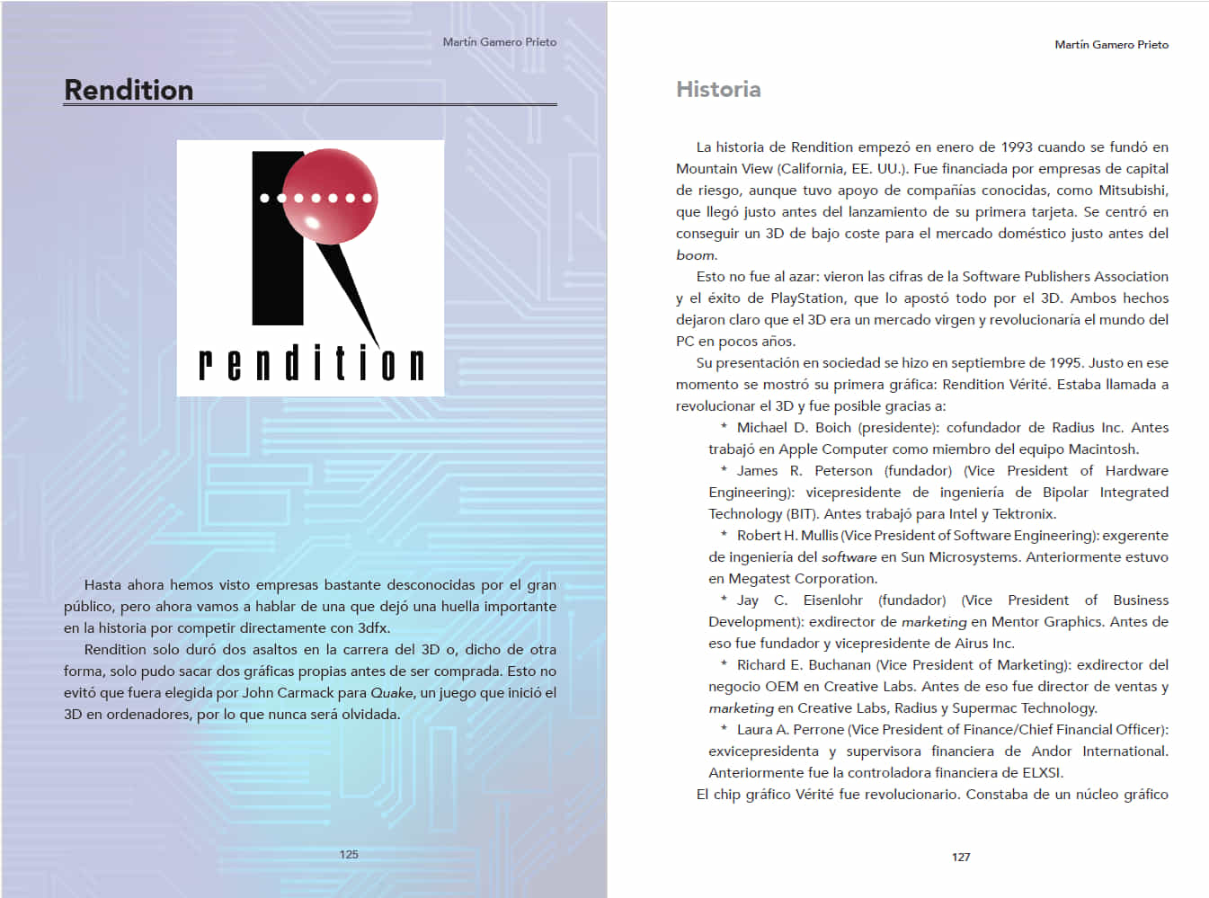 Martín Gamero es coleccionista de videojuegos desde principios del año 2000. En 2019, decidió crear su propio sello editorial para salvaguardar la historia de las tarjetas gráficas, las sagas y las empresas de videojuegos. En este tiempo ha publicado cinco libros: El legado de 3dfx, Entre soldados, demonios y polígonos, Tu objetivo está aquí, S.T.A.L.K.E.R., El legado de las olvidadas y Westwood y la saga Command & Conquer. Todas sus obras y colaboraciones se encuentran disponibles en kentinelstudios.com.