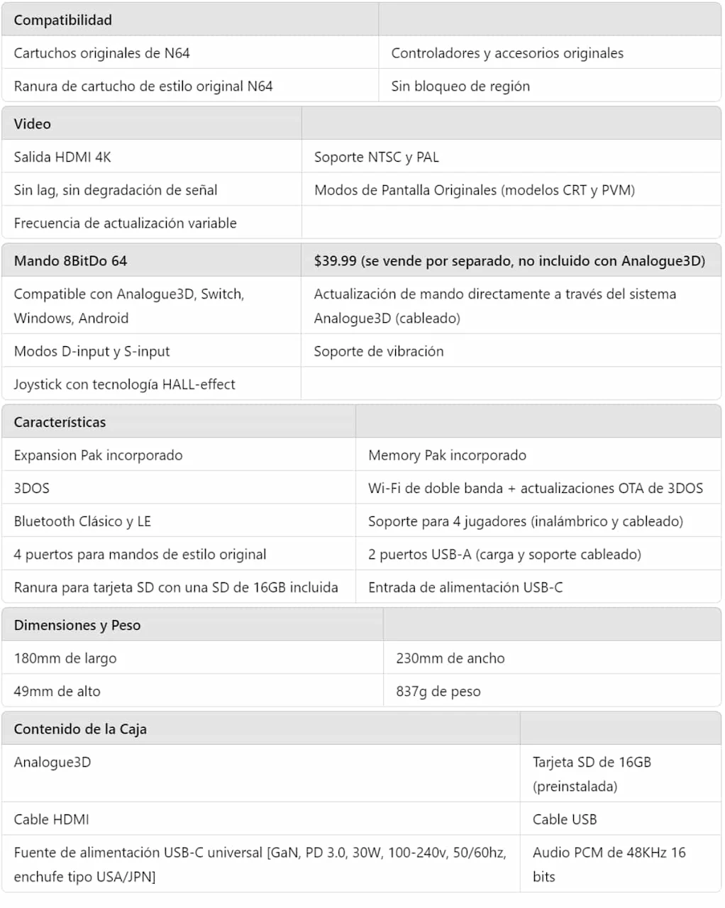 Analogue3D es la nueva apuesta que redefine la consola N64, llevándola a una resolución 4K, multiplicando por 10 la calidad gráfica del N64 original. Con compatibilidad del 100% para todos los juegos originales de N64, sin restricciones de región, soporte para Bluetooth LE y Wi-Fi de doble banda, y cuatro puertos para mandos de estilo original, Analogue3D está diseñada para los jugadores más exigentes. Todo ello con hardware de última generación impulsado por 3DOS y completamente desarrollado en FPGA, garantizando una recreación fiel sin emulación, ofreciendo una experiencia sin limitaciones.