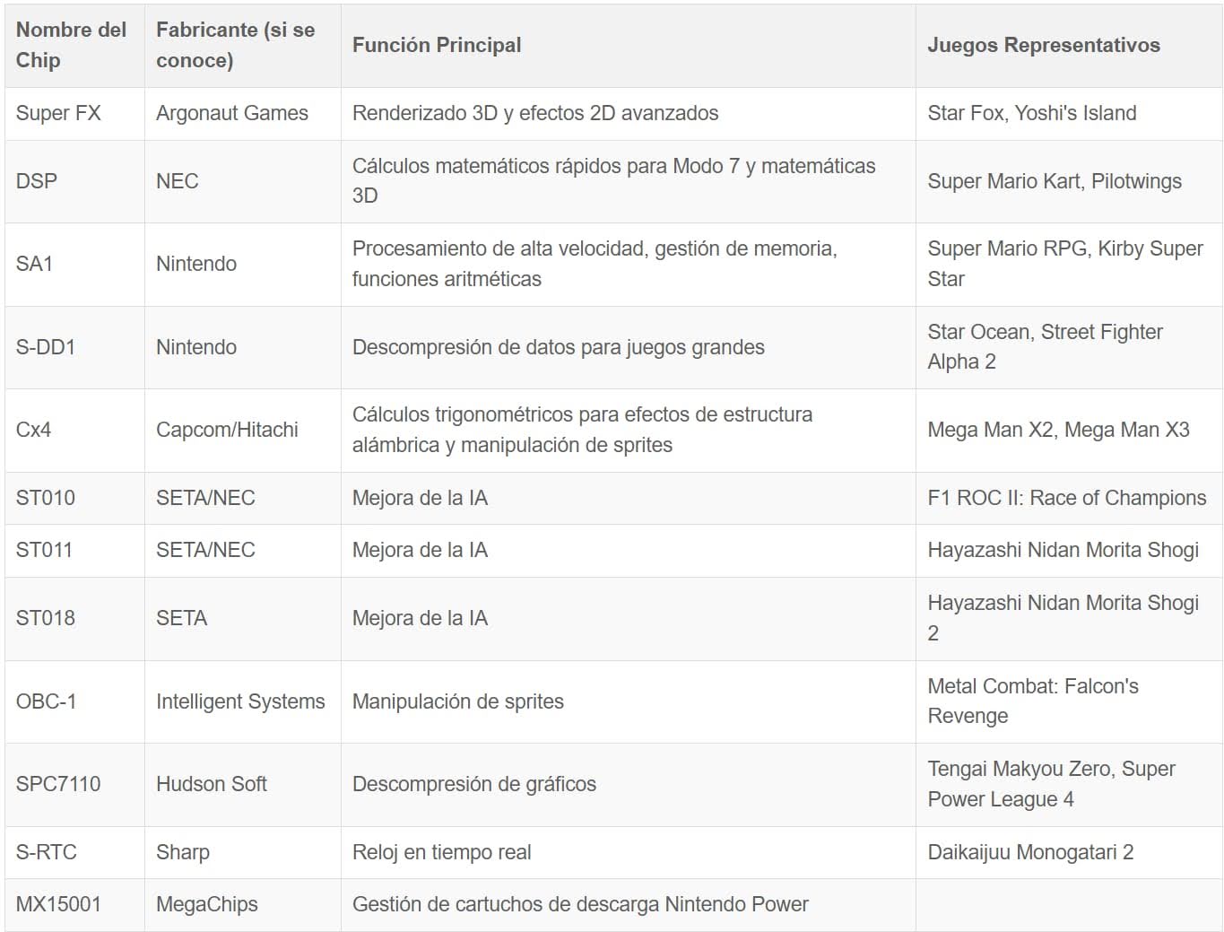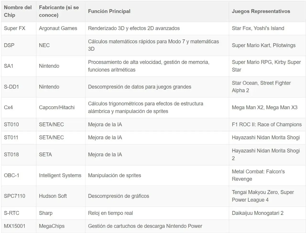 Algunos ejemplos destacados incluyen el Super FX, que abrió las puertas al 3D poligonal; el DSP, esencial para efectos gráficos complejos como el Modo 7; el SA1, que proporcionaba una mejora general del rendimiento; y el S-DD1, encargado de la descompresión de datos. Otros chips importantes son el Cx4, utilizado por Capcom para cálculos avanzados; la serie ST, dedicada a la inteligencia artificial; el OBC-1, para la manipulación de sprites en un juego de pistola de luz específico; el SPC7110, para la descompresión de gráficos en juegos de Hudson Soft; el S-RTC, que ofrecía funcionalidad de reloj en tiempo real; y el MX15001TFC, para la gestión de juegos descargados en Japón.