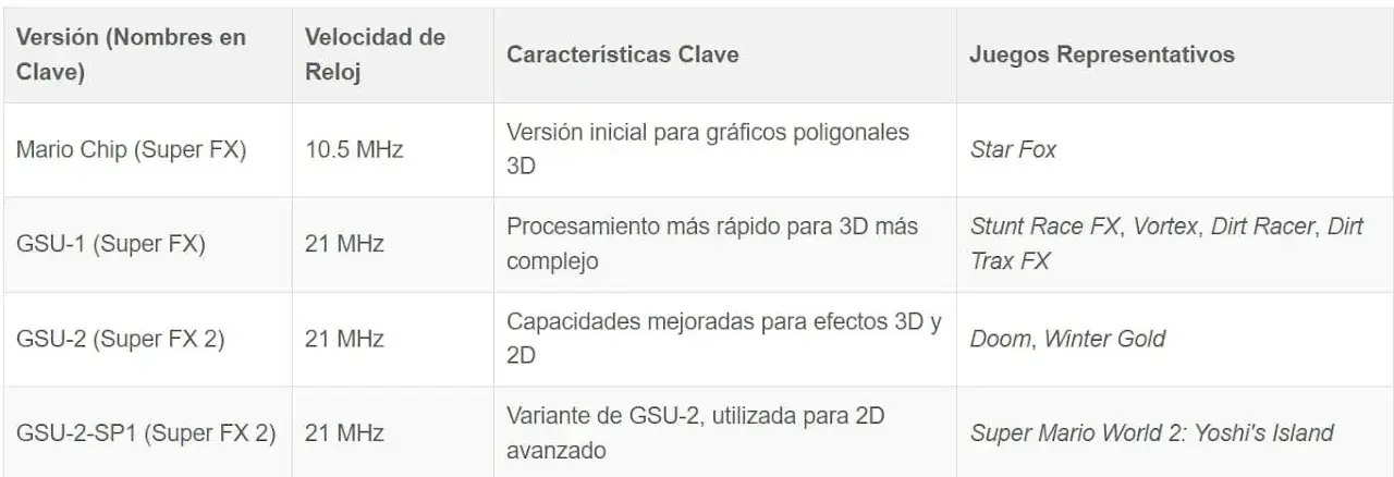 - GSU-2 y GSU-2-SP1: Otra versión de 21 MHz con posibles mejoras arquitectónicas adicionales, aunque el Super FX2 no proporcionó inherentemente funcionalidad adicional sobre el Super FX. El GSU-2-SP1 probablemente tuvo revisiones menores o se empaquetó de manera diferente.
