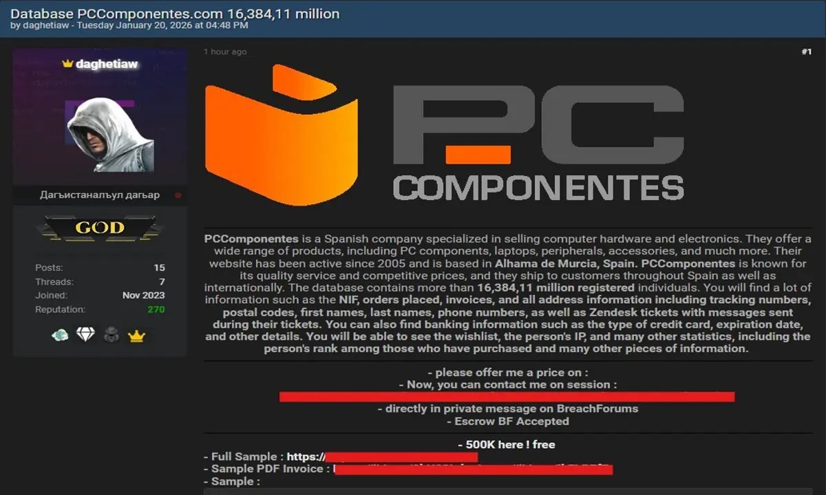 A threat actor using the alias daghetiaw claims to have breached PCComponentes.